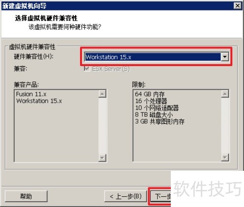 3、 保持硬件兼容性默认设置为Workstation 15.x,随后点击下一步继续操作。