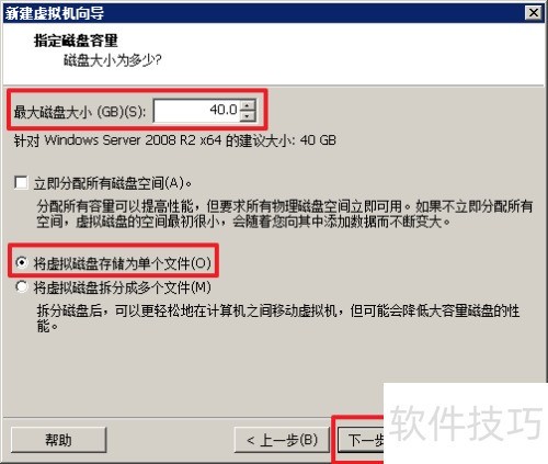 14、 磁盘容量设为40GB即可,支持自定义调整,选择单文件存储模式后,点击下一步继续操作。