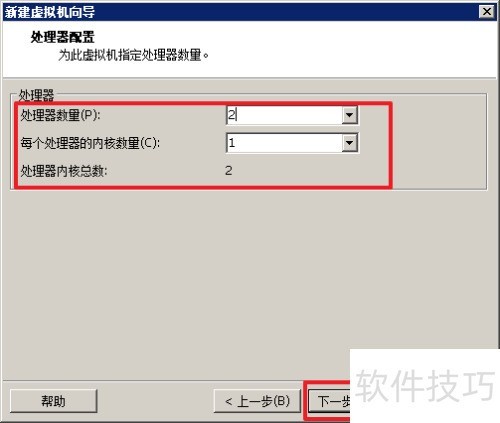 8、 将处理器数量设为2,每处理器核心数设为1,可按需调整后点击下一步。