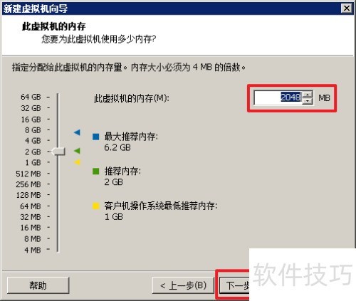 9、 将虚拟机内存设为2048MB,可按需调整,随后点击下一步继续操作。