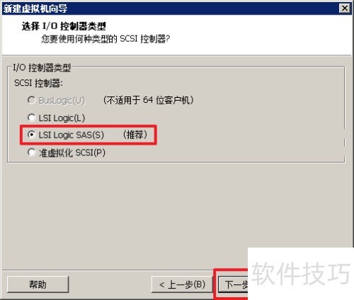 11、 选择默认的LSI Logic SAS作为SCSI控制器,随后点击下一步继续操作。