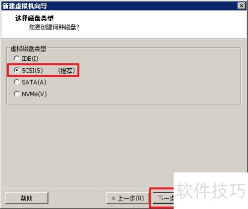 12、 选择默认的SCSI虚拟磁盘类型,随后点击下一步继续操作。