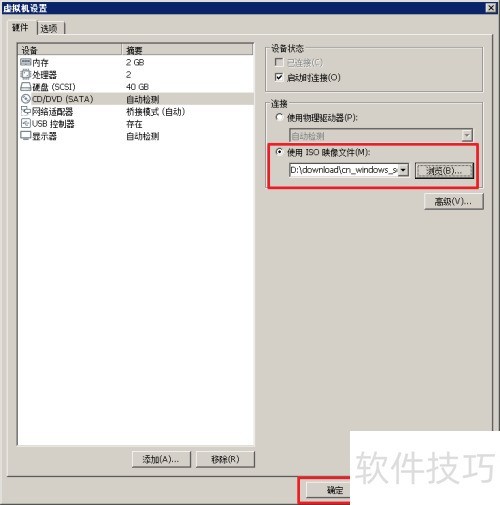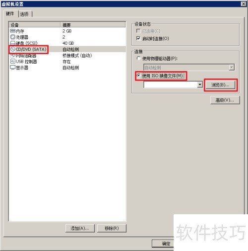 24、 选择CD/DVD (SATA),勾选使用 ISO 映像文件,点击浏览按钮,找到并选中存放 ISO 文件的文件夹。