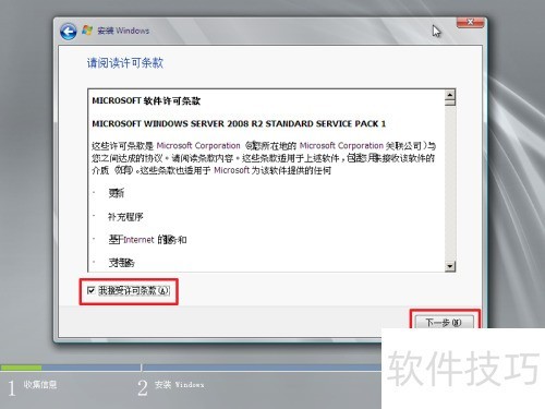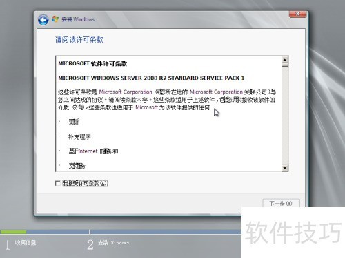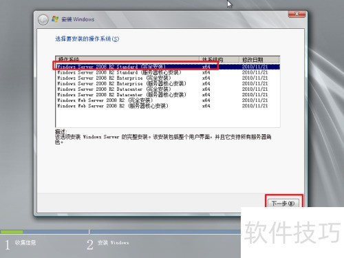 30、 选择Windows Server 2008 R2 Standard(完全安装)或其他所需版本,其中完全安装包含图形操作界面,而服务器核心安装仅提供命令行模式,无图形界面。确认选择后,点击下一步继续操作。