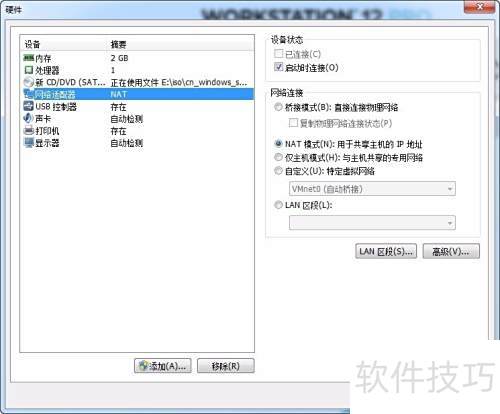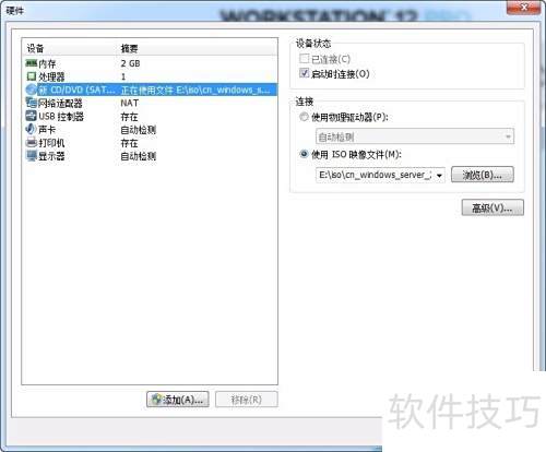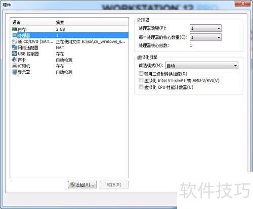 9、 此处可查看并修改虚拟机的硬件配置,支持添加或删除部分设备。但内存、处理器和光驱等关键配置无法移除,相关选项呈灰色不可用状态,而如网卡等其他设备则可根据需要进行移除或添加操作。