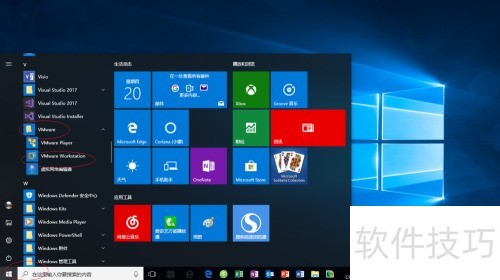 1、 启动Windows 10系统后,点击任务栏上的开始按钮,从菜单中依次选择VMware和VMware Workstation程序启动虚拟机软件。