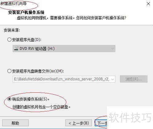 3、 出现安装客户机操作系统窗口,选择稍后安装操作系统选项,然后单击下一步继续操作。