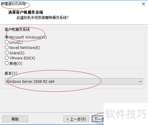 4、 所示,弹出选择客户机操作系统对话框后,选中Microsoft Windows选项,然后点击版本右侧的下拉箭头,在列表中选择Windows Server 2008 R2 x64。