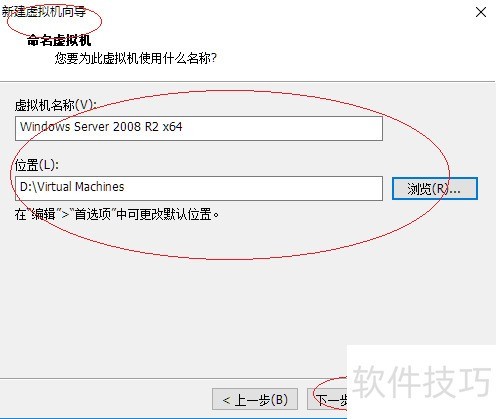 5、 弹出命名虚拟机对话框后,在虚拟机名称栏输入名称,点击位置旁的浏览按钮,选择虚拟机的安装路径。