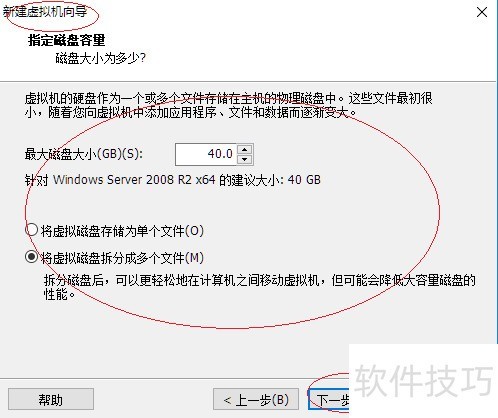 6、 所示,弹出指定磁盘容量窗口,设定最大磁盘空间,并勾选将虚拟磁盘分割为多个文件选项。