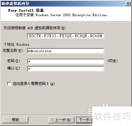 4、 输入操作系统CDKEY、计算机名和管理员密码,点击下一步,进入虚拟机命名和虚拟文件存储路径设置界面。