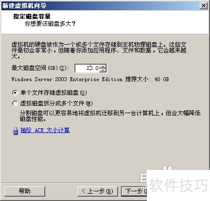 2、 计划在虚拟机中部署Windows Server 2003系统,安装Oracle数据库并运行Tomcat服务。由于数据库容量约为2GB,为确保系统稳定运行,建议内存配置为3GB左右,同时预留充足磁盘空间以满足系统及数据库的存储需求。