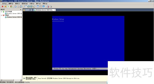 7、 点击完成后,虚拟机启动并从虚拟光盘引导,进入Windows Server 2003安装界面。