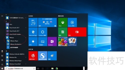 1、 启动Windows 10系统后,点击任务栏上的开始按钮,从菜单中选择VMware→VMware Workstation即可打开该程序。