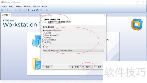 4、 所示,系统将弹出选择客户机操作系统对话框。请选中Microsoft Windows单选按钮,然后点击版本右侧的下拉箭头,在列表中选择Windows Server 2003 企业版选项,完成操作系统类型的指定。