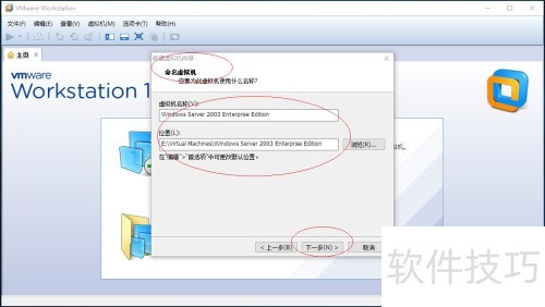 5、 弹出命名虚拟机对话框,在虚拟机名称栏输入名称,点击位置旁的浏览按钮,选择虚拟机的安装路径。