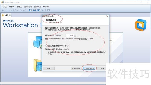 6、 ,出现指定磁盘容量窗口,设定最大磁盘空间,并勾选将虚拟磁盘分割为多个文件选项。