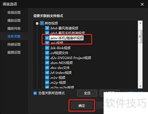 6、 勾选.amv-手机/随声听视频选项,然后点击下方确定按钮完成操作。