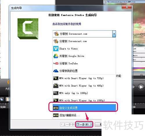 9、 点击下拉菜单,选自定义生成设置,再点下一步。