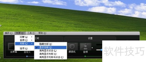 4、 检查工具栏中的音频选项,若右侧有可调节的蓝色按钮则表示已开启,否则需点击音频启动。接着在工具栏上方的效果下拉菜单中选择光标并设置为显示光标,确保光标可见,以便在录制过程中随时用光标标注讲解位置。