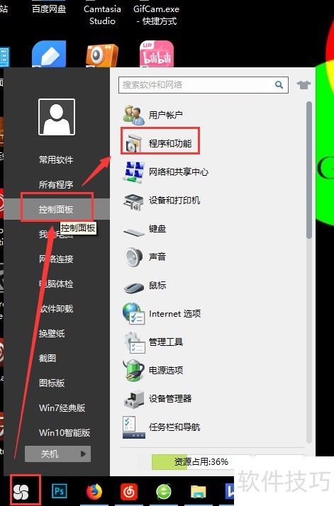 2、 点击电脑左下角的Windows图标,打开后找到并进入控制面板,在其中选择程序与功能进行操作。