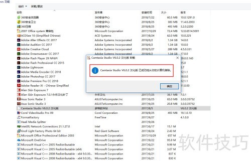 5、 点击确认卸载后,软件将自动开始卸载流程,待卸载完成后,系统会弹出提示窗口,告知Camtasia Studio已成功从您的电脑中移除。