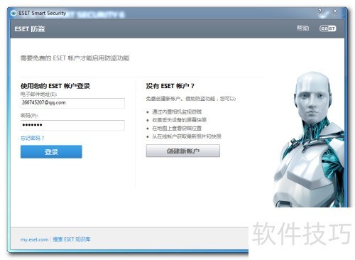 1、 在ESET Smart Security中开启防盗功能,需先登录您的账号。若尚未拥有账号,请点击创建按钮进行注册,按照提示完成ESET Smart Security账号的注册流程后,再登录系统即可启用防盗设置。整个过程简单便捷,确保设备安全得到有效保障。