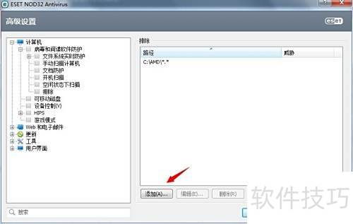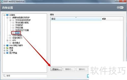 3、 进入NOD32高级设置,依次选择计算机、病毒和间谍软件防护、排除,点击添加按钮,将需要信任的文件加入排除列表即可。