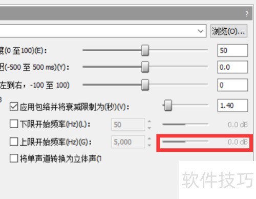 6、 要调节已处理信号的高频部分,需勾选上限开始频率选项,并将起始频率设定在8000至10000赫兹范围内。通过拖动增益调节滑块,可设置对该频率以上频段的增强或衰减程度,具体操作5所示。