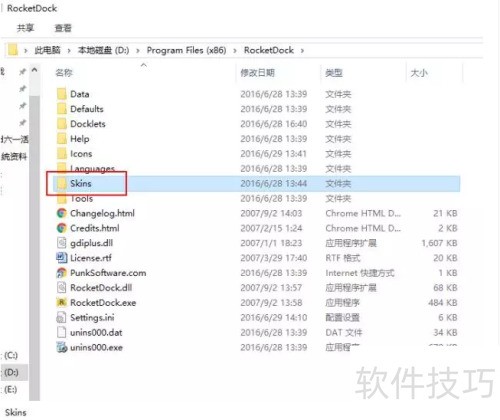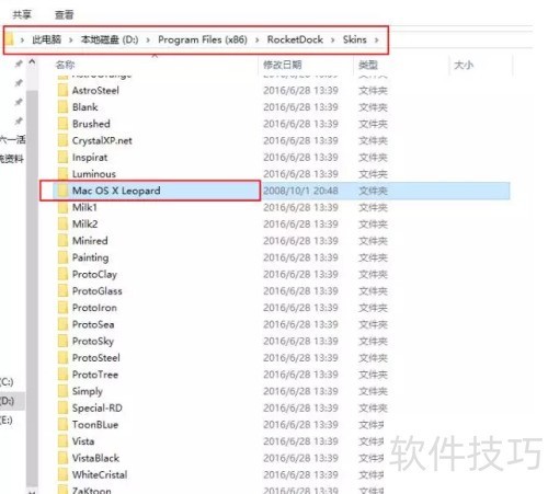 21、 将解压后的Mac OS X Leopard文件夹复制到RocketDock-v1.3.5安装目录中的skins文件夹内即可完成皮肤添加。