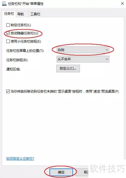13、 勾选自动隐藏任务栏,并将位置设为右侧或其他偏好位置,点击确定。若未勾选锁定任务栏,可用鼠标将任务栏拖动至屏幕任意一边;若已锁定,则无法移动。