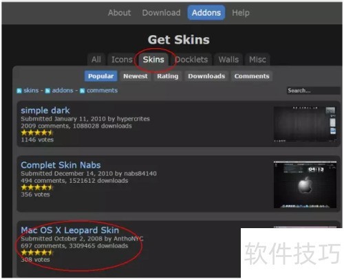 19、 进入官网素材下载页面后,在skins目录中可找到Mac OS X Leopard Skin,这正是我们需要的皮肤文件。不过你之前已从百度云下载的资料包中包含了该文件,因此无需再次从官网重复下载,直接使用已有文件即可。