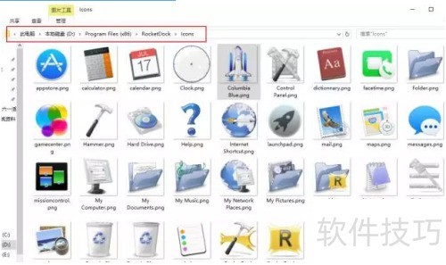 37、 将之前下载的文件夹内所有Mac图标复制到软件的图标目录中,即可在此处显示。例如,我的路径为D:Program Files (x86)RocketDockIcons。