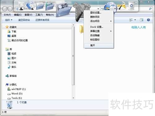 4、 这些项目均可自定义,右键点击图标可打开设置菜单,支持删除或添加(可拖拽操作),末尾设有垃圾箱和设置选项。退出时,点击图标后选择离开即可。