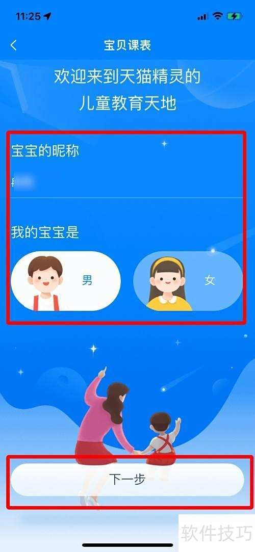 4、 在页面中输入孩子姓名与性别后,点击下一步继续操作。