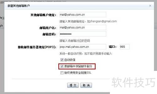4、 在新建其他邮箱账户时,填写完整的雅虎邮箱地址和密码,系统将自动显示接收邮件服务器地址及端口号,确认无误后点击提交即可完成设置。