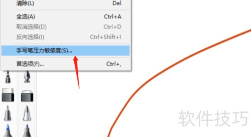 4、 在编辑菜单中选择手写笔压力感应设置