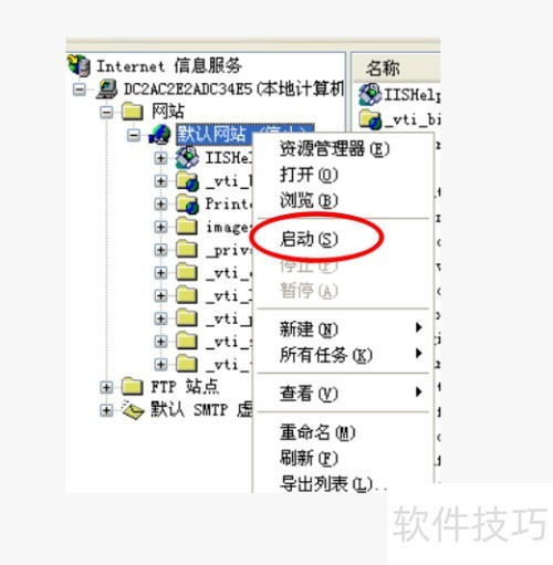 9、 检查默认Web站点是否已启动,若未启动,可通过鼠标右键点击该站点并选择启动命令。随后,在局域网内的任意计算机上打开IE浏览器,于地址栏输入本机IP地址,若能显示预设的主页内容,即表示网站已成功在局域网中发布并可正常访问。
