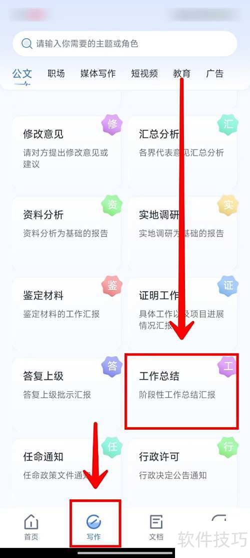 1、 打开AI公文写作应用,进入写作界面后选择工作总结功能。