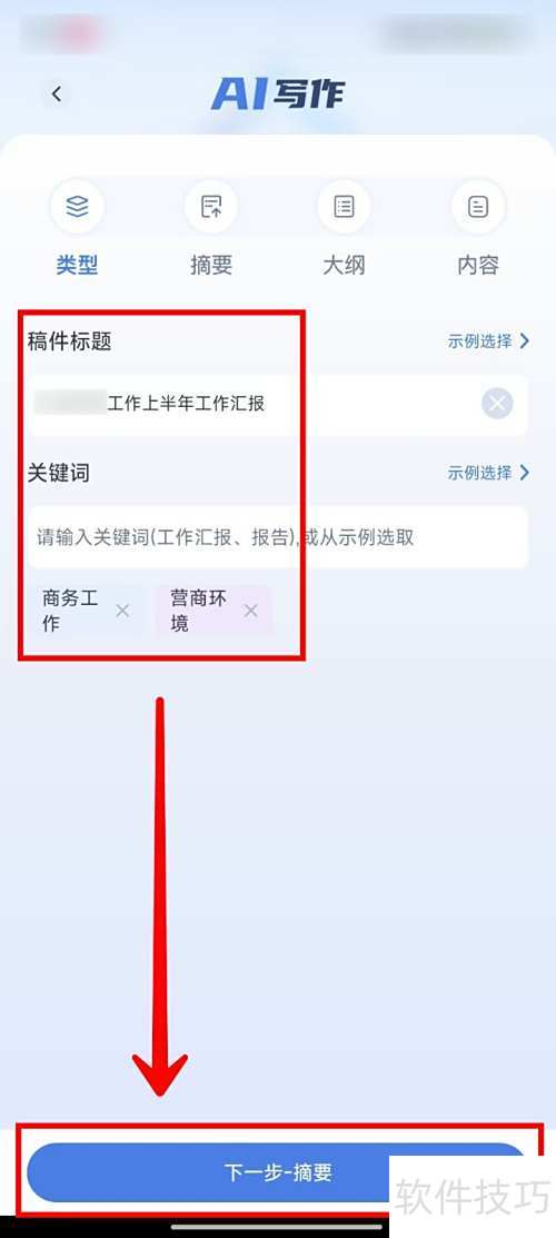 2、 在总结页面填写标题与关键词后,点击下一步摘要按钮。