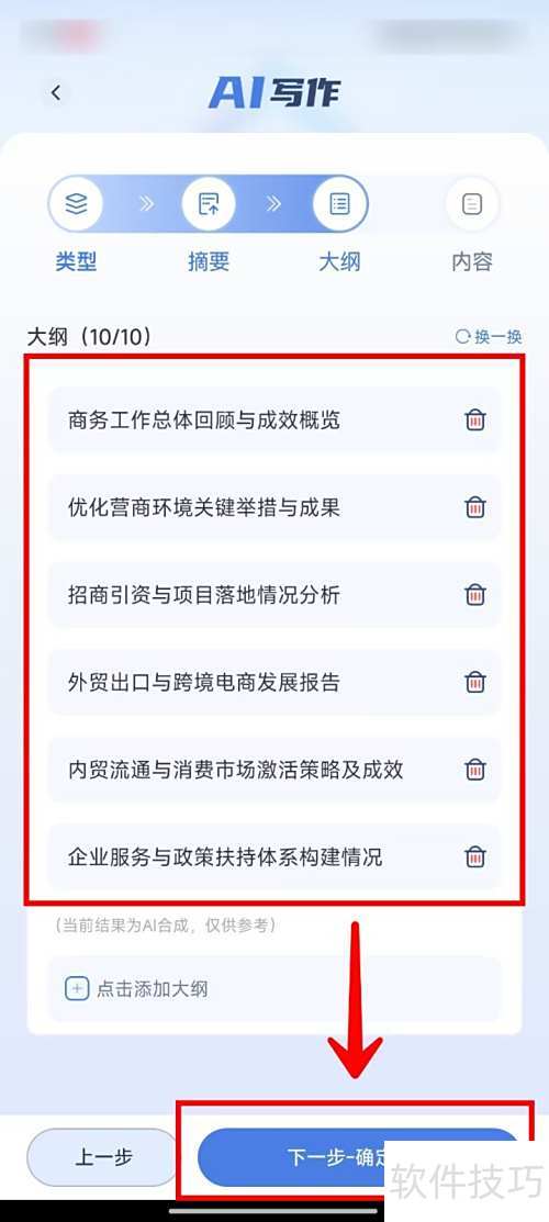 4、 在大纲页面点击下一步-确定生成,系统将自动完成工作总结。