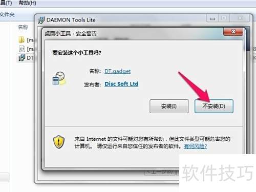 8、 使用过程中会弹出提示框,DT gadget是一款小工具,安装与否并无明显影响,建议可不安装,因为我们主要用该软件来打开镜像文件。