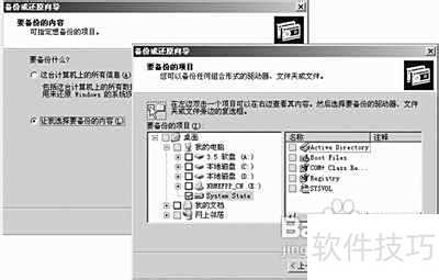 4、 选择备份文件和设置后,单击下一步进入要备份的内容界面,选中让我选择要备份的内容并继续点击下一步。在要备份的项目窗口中,逐级展开桌面→我的电脑,然后勾选System State选项,1所示,完成相关设置。