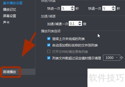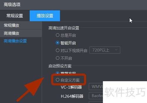 4、 进入高清播放设置,选择启动预设方案中的自定义选项。
