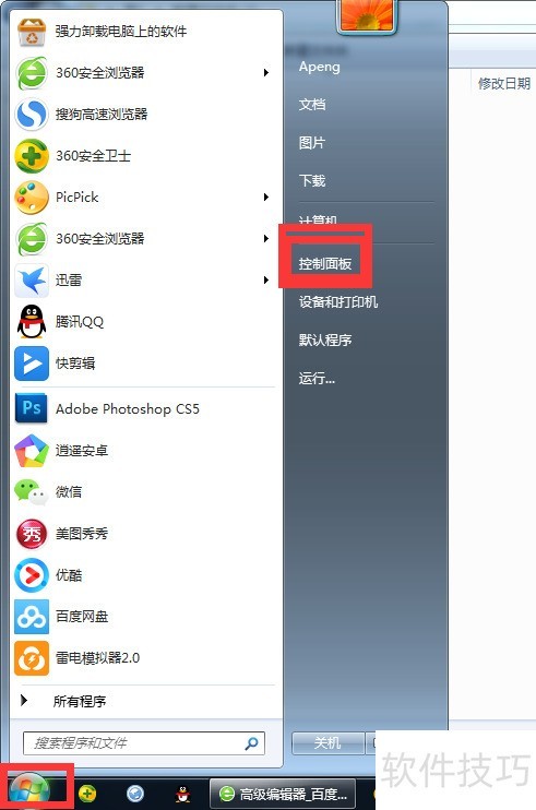 2、 点击开始菜单,选择其中的控制面板选项。