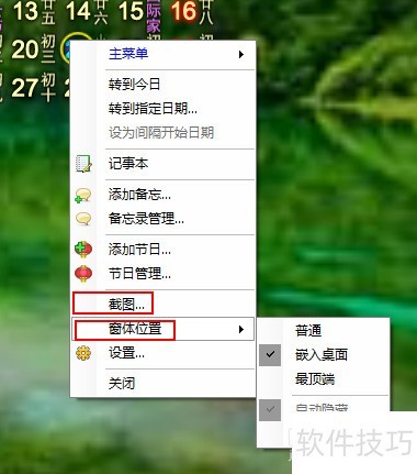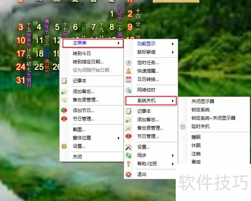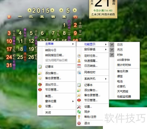 3、 在桌面日历上右键点击,打开菜单后进入主菜单的功能显示选项,可在此处勾选或取消桌面插件的显示。