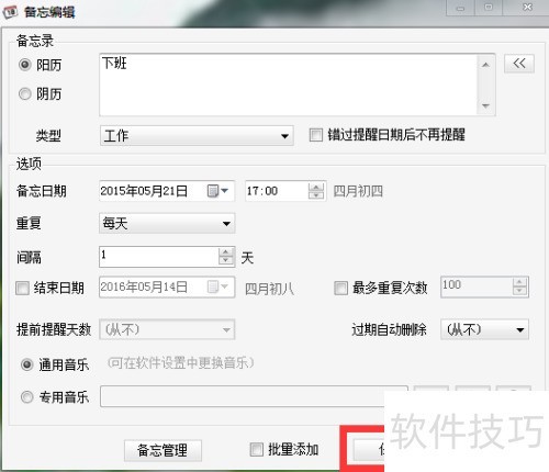 6、 弹出窗口中可添加备忘录并设置提醒通知功能。