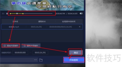 5、 只需拖动进度条,选取所需视频片段,点击添加片段指针,确认后选择开始提取,即可快速完成音频提取,操作简便流畅,轻松实现音频分离。