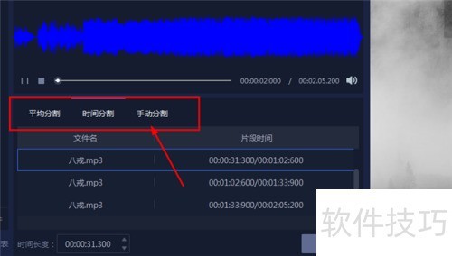 6、 音频剪辑功能提供三种分割方式:平均分割、时间分割和手动分割。多种操作模式满足不同需求,带来更灵活的选择空间,提升剪辑效率与精准度,让用户能够细致入微地处理导入的音频内容,实现理想的剪辑效果。