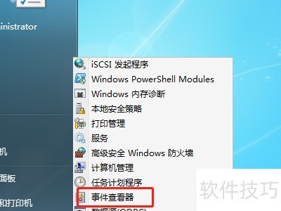 6、 点击开始菜单,选择管理工具,进入事件查看器即可看到相关选项。